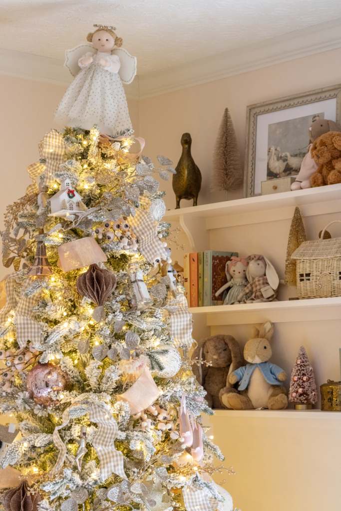 I was either feeling uncreative or maybe I just really love her tree like it is, but I decorated it just the same for the third year in a row. I usually like to switch up the ribbon on a tree, but I decided to use the ribbon we already had on hand again this year. This flocked tree was provided by King of Christmas a number of years ago (linked below) and the ornaments have been collected over the last three Christmas’. It’s the sweetest tree and we love the warm twinkling lights in the evening while reading books before bed. You can see her Christmas bedroom from last year here.