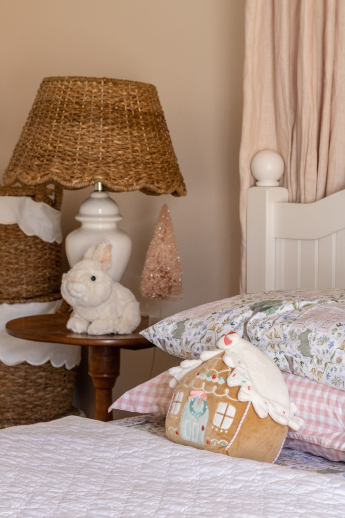 We have not removed the textured ceiling in her room quite yet. We’ll be tackling more rooms in the new year. I did paint her walls a color called Old Country by Benjamin Moore at 50% saturation. It’s the softest pink, almost peach color. I’ve reused all of the decor and furniture from our previous home. We wanted to keep things familiar for Audrey in her new room, not too much change all at once. If you’ve been around for a while you know that I like to purchase things and design for the long haul. There’s no use in redecorating if it’s not necessary.