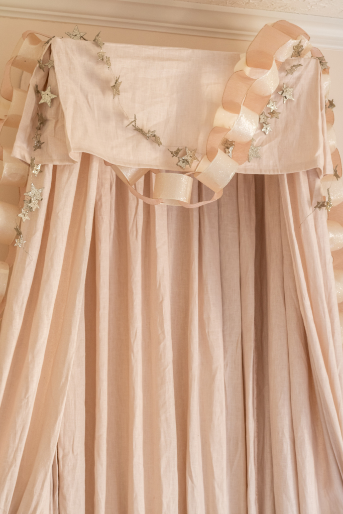 Once I hung her linen canopy from our previous home, it was obvious that it doesn’t pair very well with the wall color, so I’ll eventually replace the pink linen fabric with something different. We also plan to hang her wall sconces that were above her crib before above her bed after Christmas. I have a nightstand that I would love to refinish and put in her room for more bedside storage eventually as well.