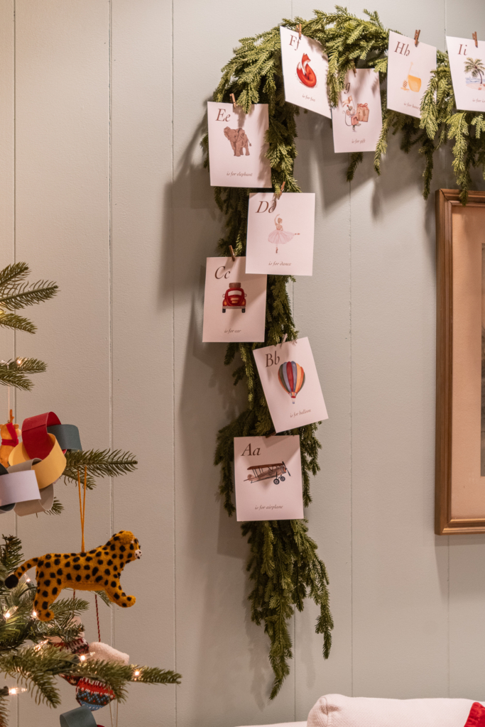 I tried to keep the holiday decor kid friendly, nothing breakable. Audrey’s alphabet cards were pinned to a strand of garland for a touch or fun and a little pop of color.