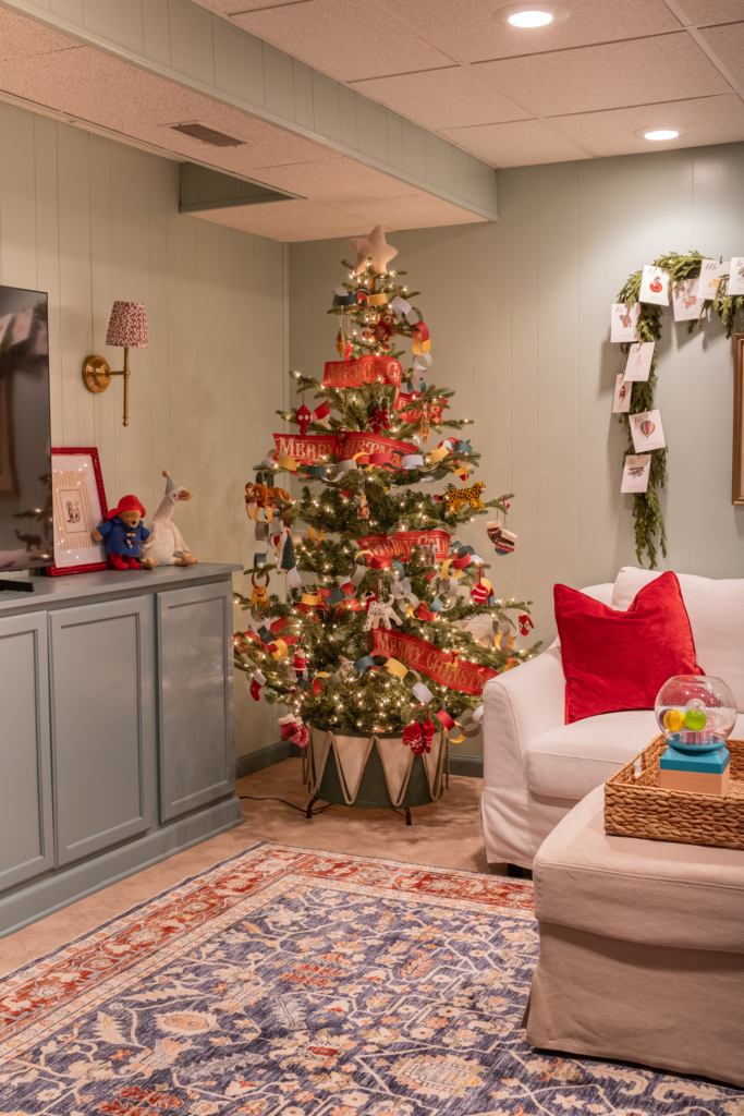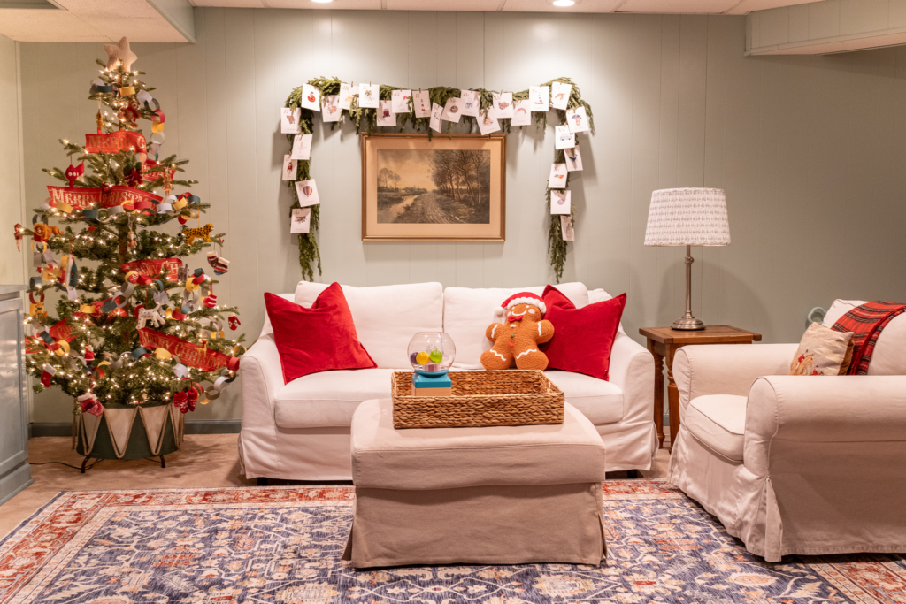 Christmas is just a few days away and I’ve been so anxious to share the space with you all. While this is the last room of our home tour, this was actually the first room we decorated for Christmas. This is Audrey and Charlie’s playroom, and also doubles as a family movie room. This room is located in our basement and was already finished when we purchased our house. Unfortunately, this room doesn’t have any windows like other parts of our basement, so there isn’t any natural light. It made taking photos a bit tricky, so bear with me!