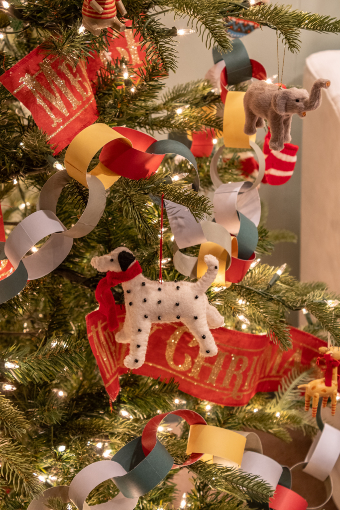 The tree that we used in this room is my all time favorite tree! It was once Charlie’s tree. It’s filled with non breakable ornaments and paper chain that we made this year. The Merry Christmas banners were purchased 10 years ago from Hobby Lobby and I made the drum tree collar. It’s a bit small for this particular tree. The tree that it was originally made fo was a bit smaller. However, you can find my tutorial for the collar here.