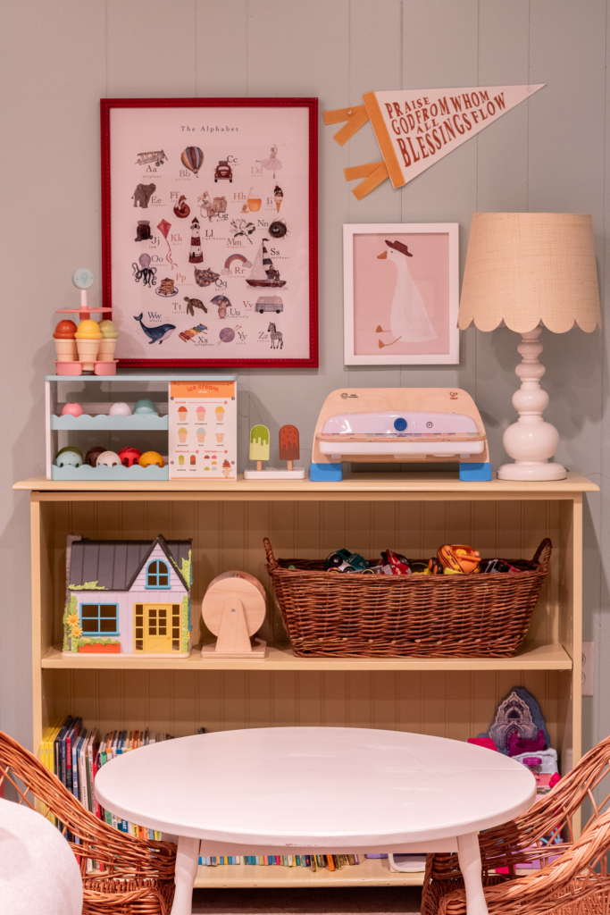 Most of the toys are tucked away in the back of the room. Charlie’s kitchen set that we built is still going strong and the table and chairs from Audrey’s nursery at our previous home have been moved to this room. The bookshelf is painted in Hay by Farrow & Ball. This bookshelf was actually left at our previous house when we purchased it. Only in the last couple of months have I refinished it. I love the color we chose and it holds books and toys perfectly.